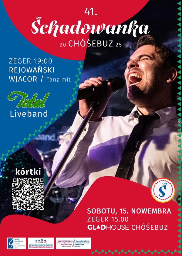Ab 19 Uhr beginnt dann der Abend mit Tanz unter Anleitung und einem kleinen Programm des Niedersorbischen Gymnasiums, Gesang und der Musik einer Nachwuchsband. Ab 21 Uhr übernimmt dann die Liveband TOTAL. Wir freuen uns über alle Gäste, die die sorbische Kultur mögen. Ihr könnt tanzen, euch mit Freunden treffen, eure Tracht ausführen oder in „40 Jahre Schadowanka“ stöbern.